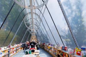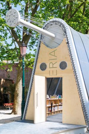 La Libreria is a temporary, lightweight structure exhibited at the 2025 Biennale Architettura. It is designed for transportability and to support literacy and a love of reading. It builds upon a long tradition of lightweight tensile structures, particularly Robert le Ricolais’ sculptural tensegrity experiments from the mid-twentieth century that aspired to ‘zero weight and infinite span.’ Adapting this research, an elongated tensegrity beam spanning the 24-meter long axis of the space supports the tent’s fiber-reinforced transparent skin. La Libreria is unanchored to the ground and stabilized by ballasts and books, enabling this mobile bookstore to travel and engage the world.