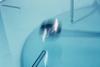 Nicotine/Caffeine Table, commissioned for the Slow House, is made of three layers of tempered glass embedded with two bubble levels and clamped together by three adjustable legs.